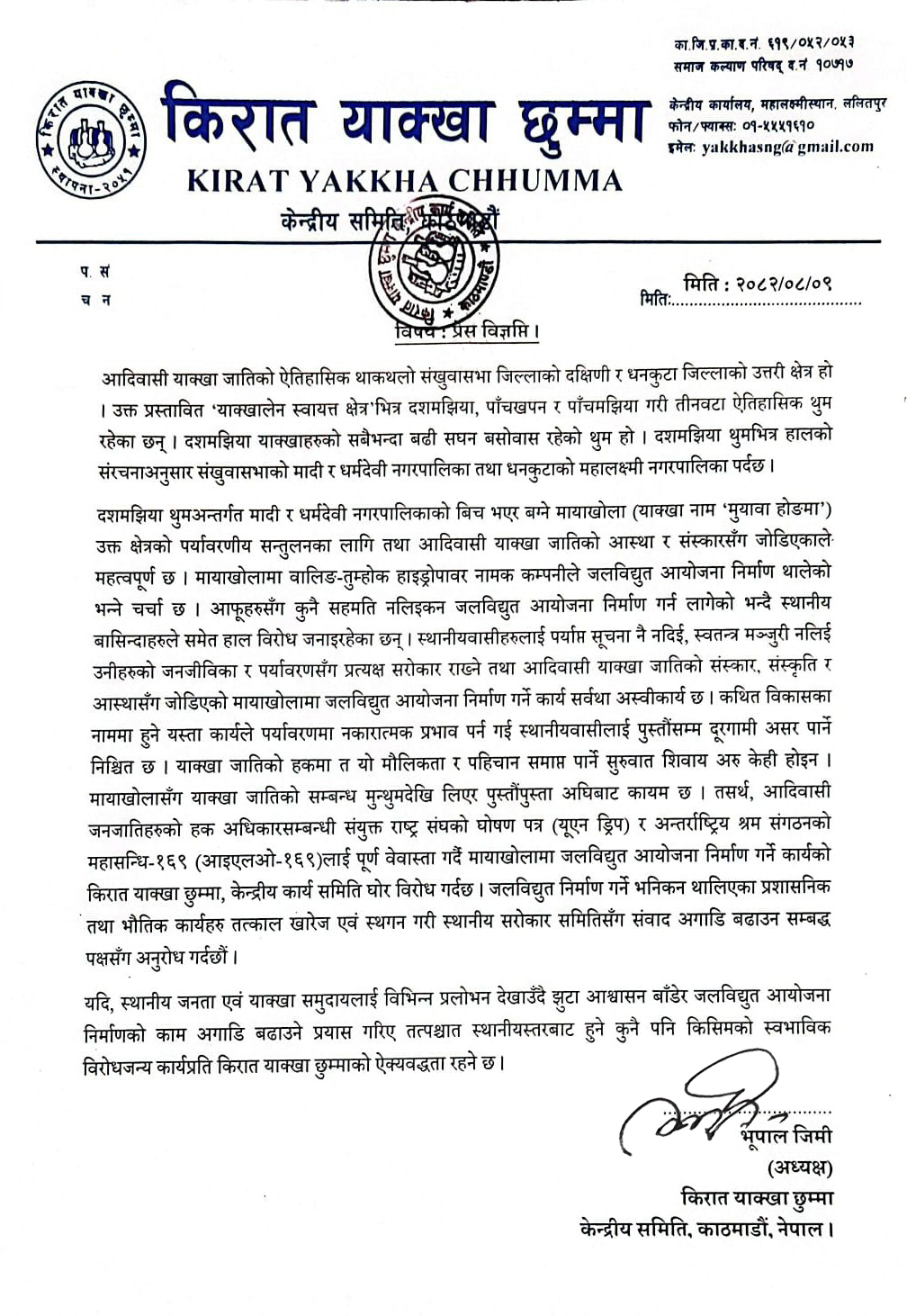 स्थानीयवासीहरुलाई पर्याप्त सूचना नै नदिई, स्वतन्त्र मञ्जुरी नलिई उनीहरुको जनजीविका र पर्यावरणसँग प्रत्यक्ष सरोकार राख्ने तथा आदिवासी याक्खा जातिको संस्कार, संस्कृति र आस्थासँग जोडिएको मायाखोलामा जलविद्युत आयोजना निर्माण गर्ने कार्य सर्वथा अस्वीकार्य हुने छुम्माले जानकारी गराएको छ । ‘कथित विकासका नाममा हुने यस्ता कार्यले पर्यावरणमा नकारात्मक प्रभाव पर्न गई स्थानीयवासीलाई पुस्तौंसम्म दूरगामी असर पार्ने निश्चित छ । याक्खा जातिको हकमा त यो मौलिकता र पहिचान समाप्त पार्ने सुरुवात शिवाय अरु केही होइन । मायाखोलासँग याक्खा जातिको सम्बन्ध मुन्थुमदेखि लिएर पुस्तौंपुस्ता अघिबाट कायम छ,’ छुम्माका अध्यक्ष भूपाल जिमीद्वारा हस्ताक्षरित विज्ञप्तिमा भनिएको छ, ‘तसर्थ, आदिवासी जनजातिहरुको हक अधिकारसम्बन्धी संयुक्त राष्ट्र संघको घोषण पत्र (यूएन ड्रिप) र अन्तर्राष्ट्रिय श्रम संगठनको महासन्धि-१६९ (आइएलओ-१६९)लाई पूर्ण वेवास्ता गर्दै मायाखोलामा जलविद्युत आयोजना निर्माण गर्ने कार्यको किरात याक्खा छुम्मा, केन्द्रीय कार्य समिति घोर विरोध गर्दछ । जलविद्युत निर्माण गर्ने भनिकन थालिएका प्रशासनिक तथा भौतिक कार्यहरु तत्काल खारेज एवं स्थगन गरी स्थानीय सरोकार समितिसँग संवाद अगाडि बढाउन सम्बद्ध पक्षसँग अनुरोध गर्दछौं ।’